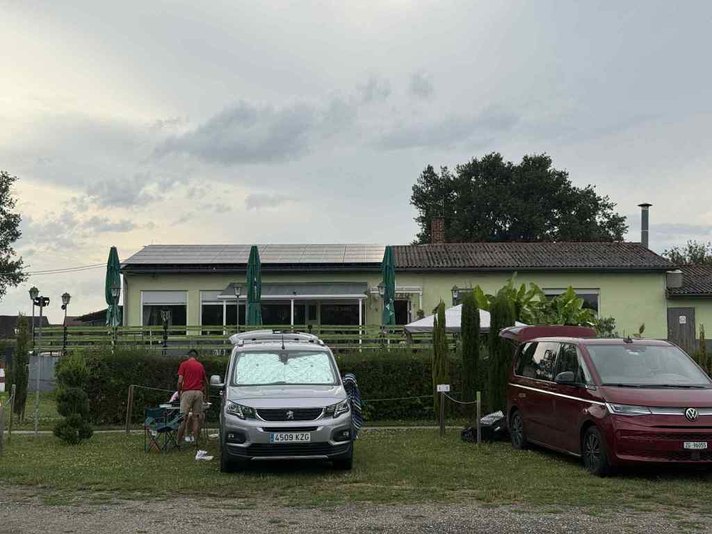 The delay to Schaffhausen only cost us an extra 35 minutes and we got to Carolines just after 7.00pm. Caroline, hubby Felix and daughter Alma were so welcoming. We had only planned to stopped for a chat and take them out for dinner but they had got a BBQ ready for our arrival (German and Swiss sausages) and they allowed us to park on their drive for the next few nights.